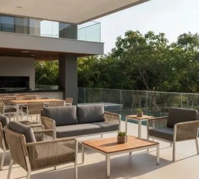 O uso de materiais como alumínio, corda náutica e madeira adequada para áreas externas fornece a durabilidade e a integração perfeita dos móveis com áreas de piscina e jardins.